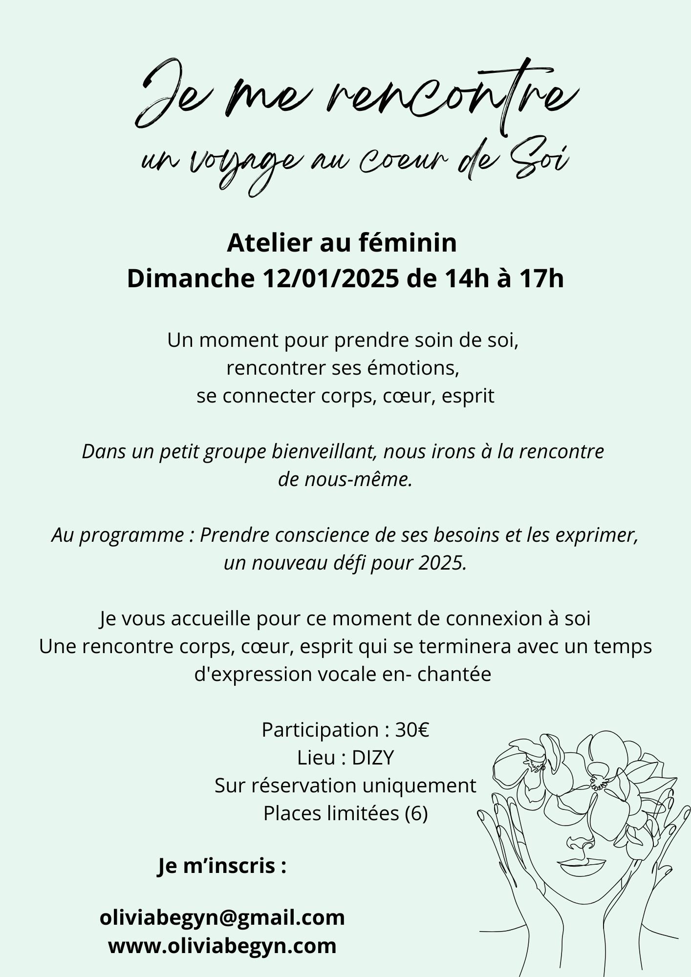 => Je me rencontre, un voyage au coeur de Soi , le 12 janvier de 14h à 17h : Pour cette atelier plus axé “développement personnel”, je mets mes compétences de thérapeute à votre service. Comment définir ses besoins et les exprimer en tant que femme ? Apprendre à écouter les messages de son corps, de son coeur et de son esprit pour se sentir alignée ? Pour réserver : https://my.weezevent.com/je-me-rencontre-apprendre-a-exprimer-ses-besoins