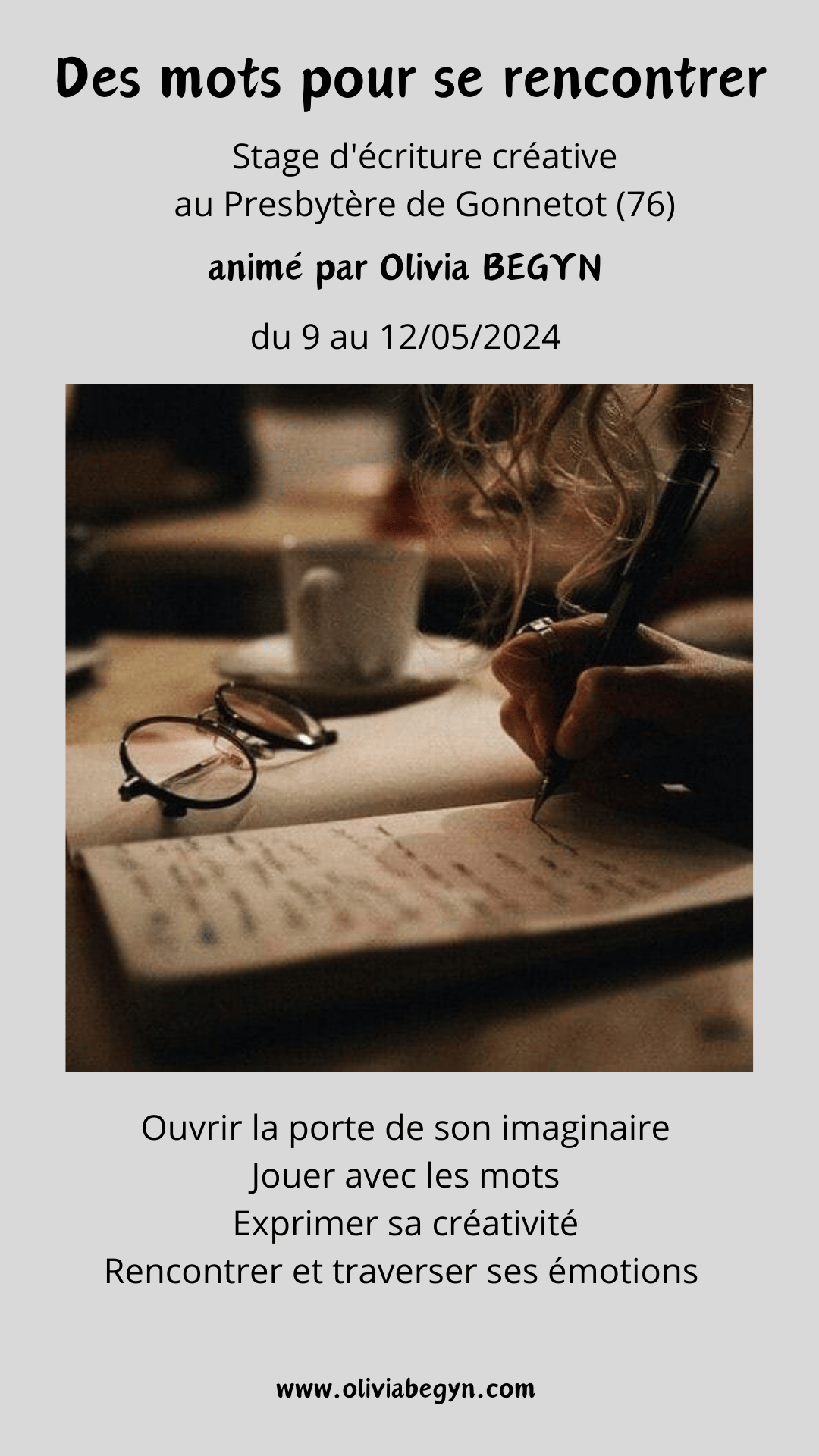 Du 9 au 12/05, toujours au Presbytère de Gonnetot, j’aurai la joie d’animer un séjour consacré à l’écriture créative. Durant ces trois jours nous viendrons à la rencontre de notre imaginaire, de nos émotions et laisserons notre créativité s’exprimer autour des mots grâce à divers stimuli. Si la météo le permet, nous irons écrire dans le jardin, la plage ou ailleurs mais également confortablement installés au Presbytère.