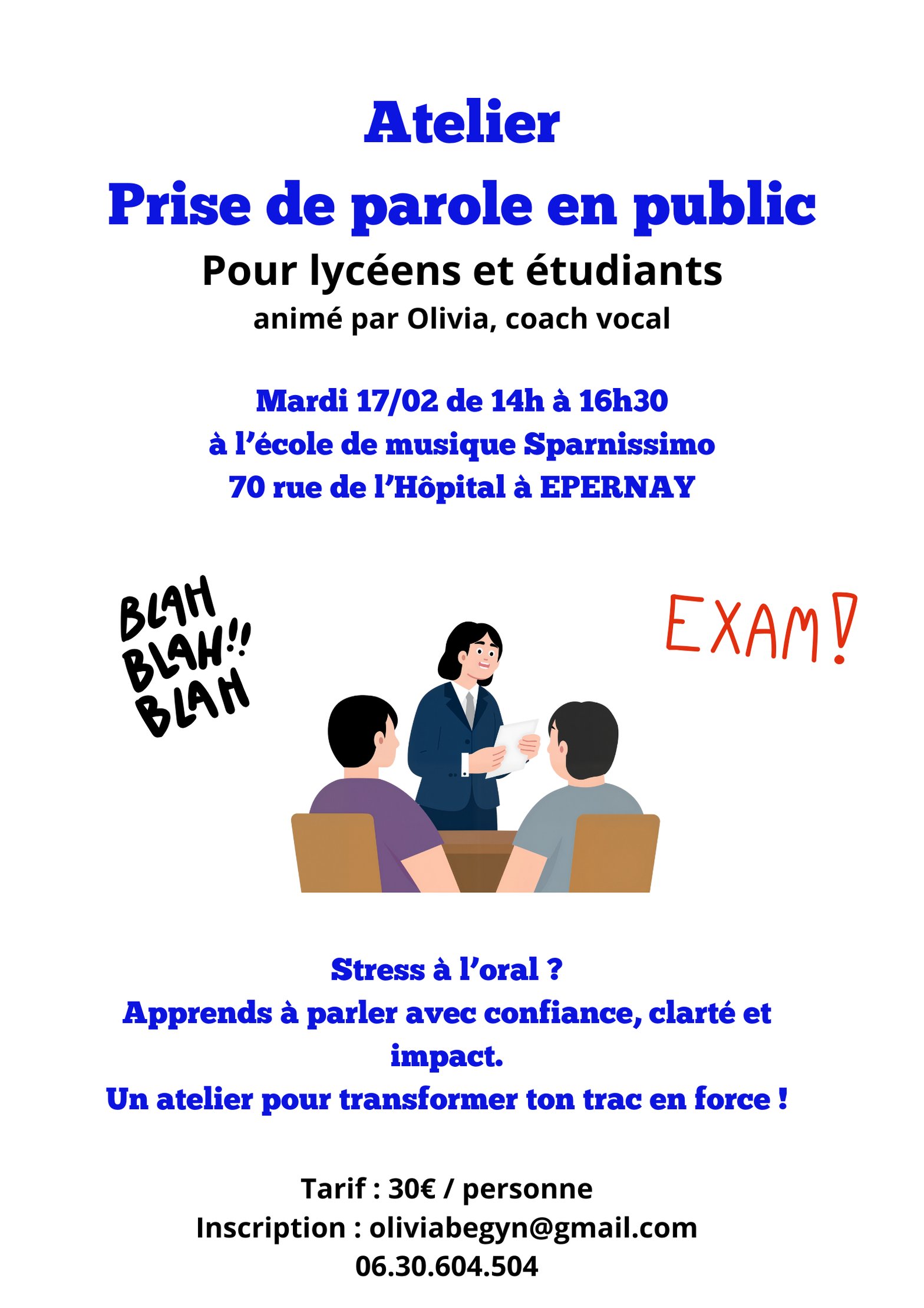 4/ Je propose le 17/02 un atelier de prise de parole en public pour les lycéens et étudiants. C’est la continuité de mes interventions que j’effectue depuis trois ans dans les lycées pour préparer nos chers lycéens à préparer l’oral de français ou le grand oral.