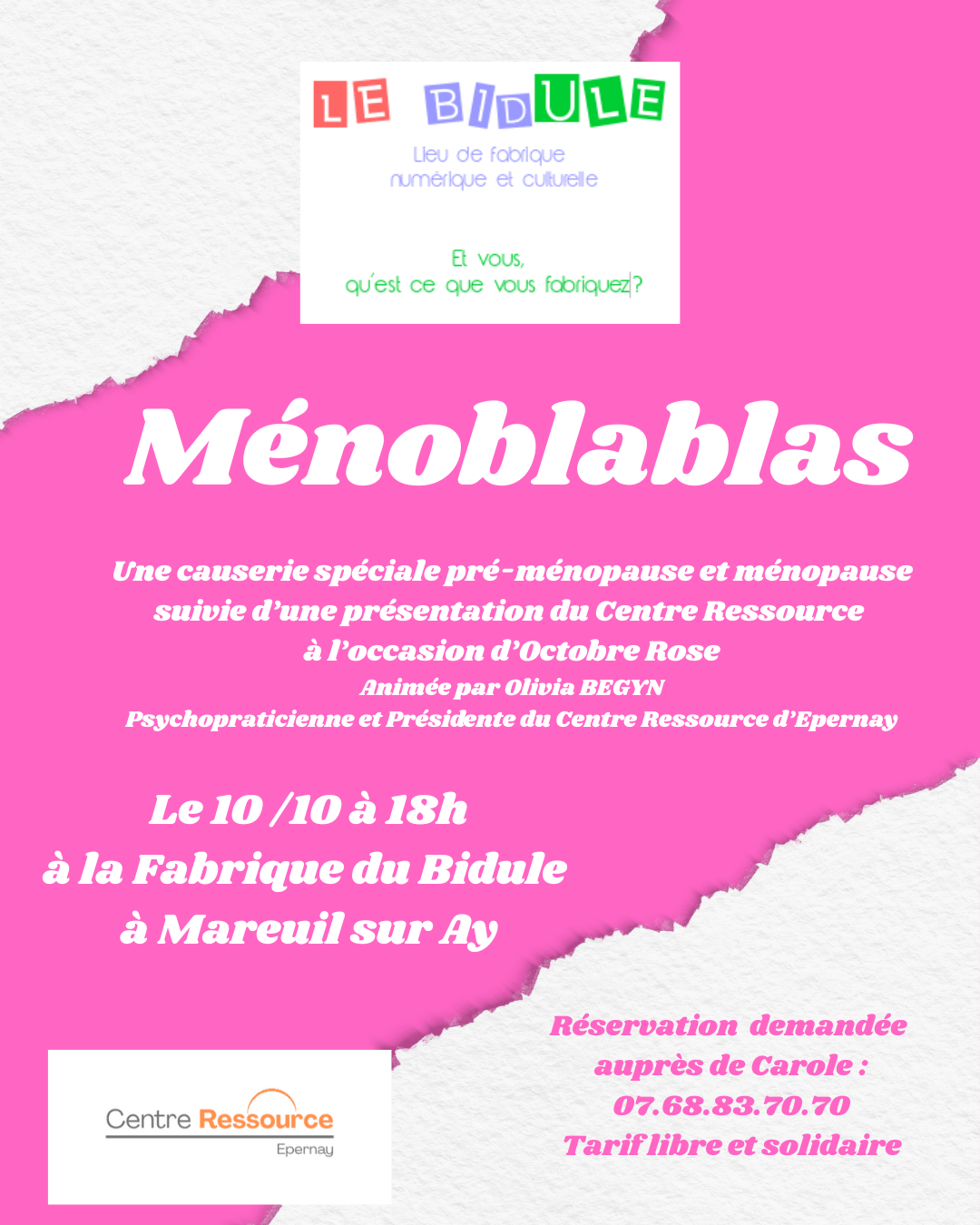 Vendredi 10/10 : Premier Ménoblablas, une causerie sur la ménopause à la Fabrique du Bidule à Mareuil sur Ay qui sera suivie par une présentation du Centre Ressource Epernay.